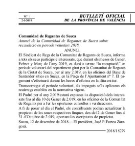 El Sindicat de Regs de la Comunitat de Regants de la ciutat de Sueca, informa a tots els seus particips i interessats, que durant els mesos de gener, febrer i març de l’any 2.019, es durá a terme “la recaptació” en període voluntari, del repartiment girat per la Comunitat de Regants de la ciutat de Sueca, per a l’any 2019, en les oficines del Banc de Santander, síties en la ciutat de Sueca, en la Plaça de l’Ajuntament, núm. 7. El pagament s’efectuarà durant les hores d’oficina en la dita entitat.