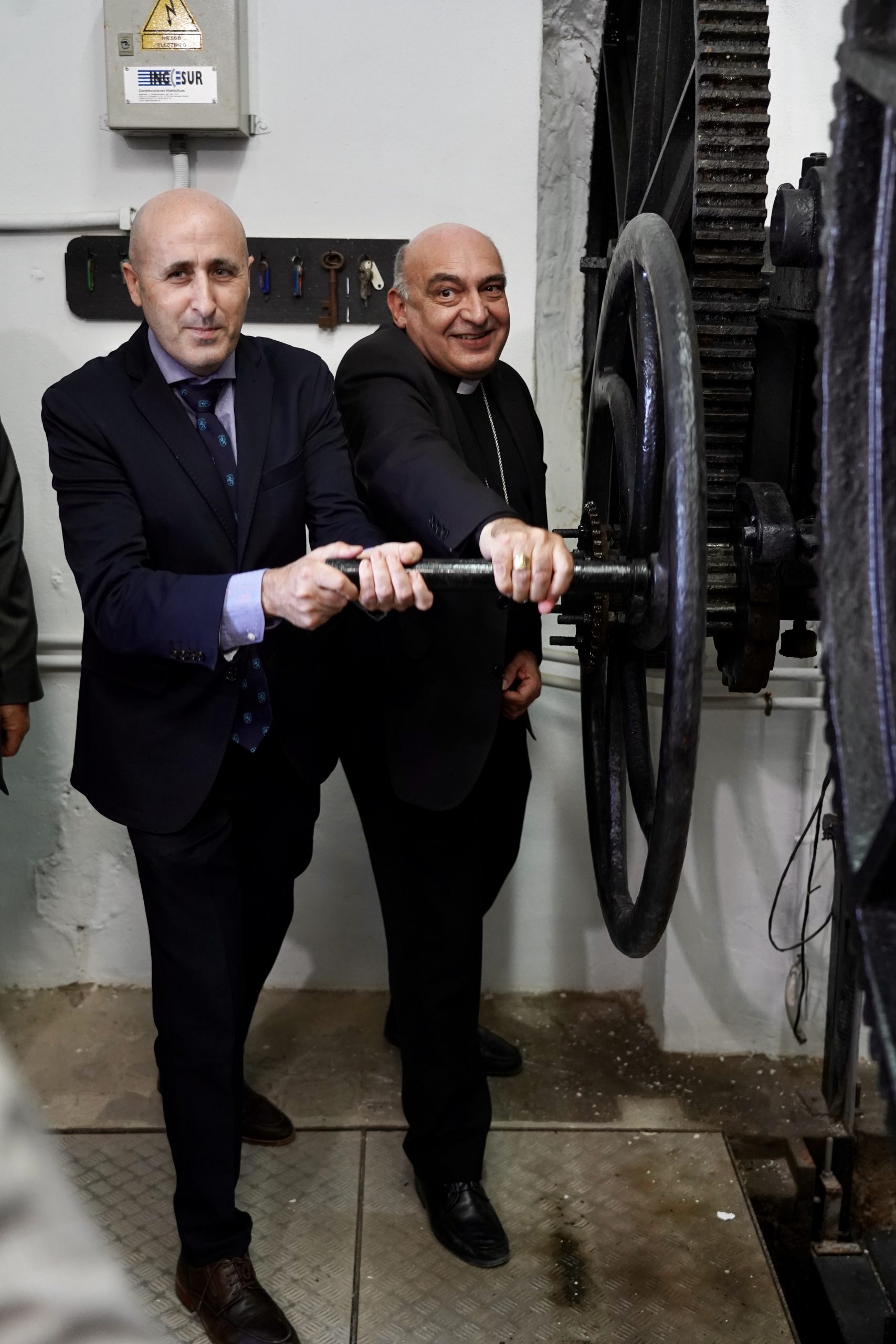 El President de la Confederació Hidrogràfica del Xúquer i l’Arquebisbe fent moure els engranatges de la comporta dels Canos per a soltar l’aigua.